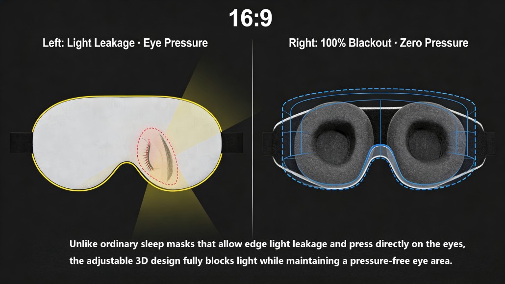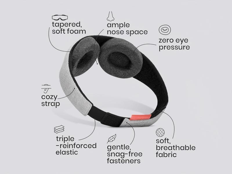 4. Aucune pression sur les yeux ou les cils — Œilletons moulés en profondeur pour un confort optimal dans toutes les positions. Dormez paisiblement, que vous soyez sur le dos, sur le côté ou sur le ventre.