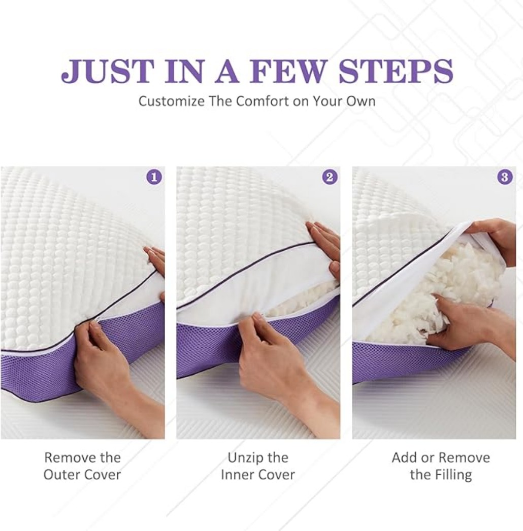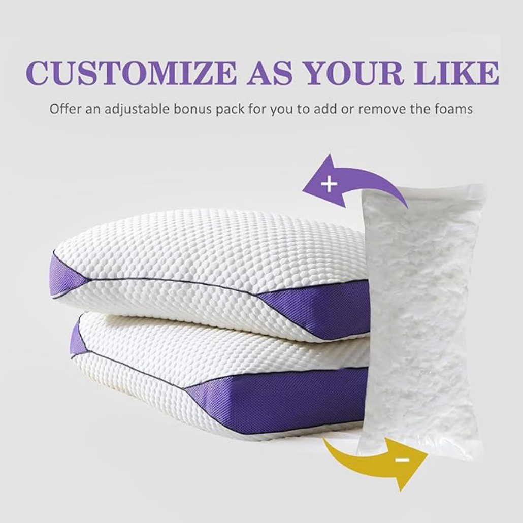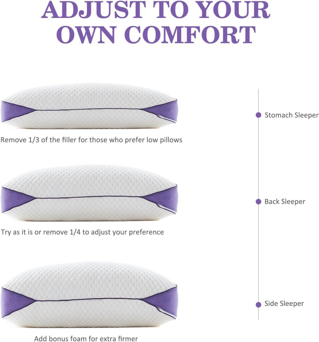 1.Adjustable Comfort: Customize your sleep experience with a 100% removable cover; adjust the foam pack to match your sleep style; each order includes one adjustable foam pack which is included and tucked inside the pillow cover; Add it if you want a higher or firmer feel