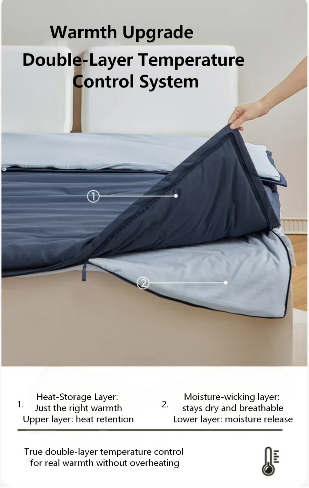 Unlike regular comforters that trap heat and moisture, this innovative design features a dual-layer system that works with your body throughout the night. The top layer gently retains warmth, while the bottom layer releases excess heat and moisture — creating a dry, breathable sleep environment.