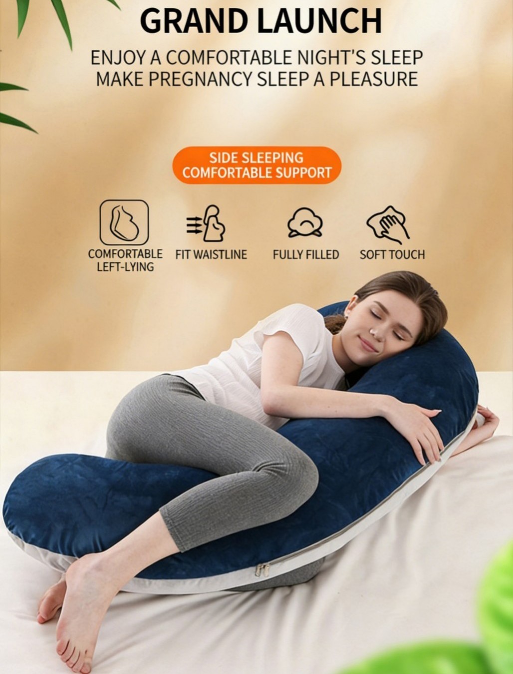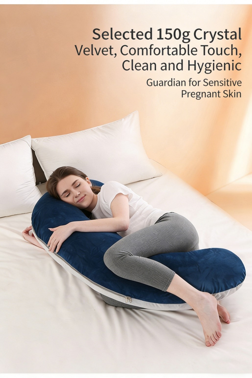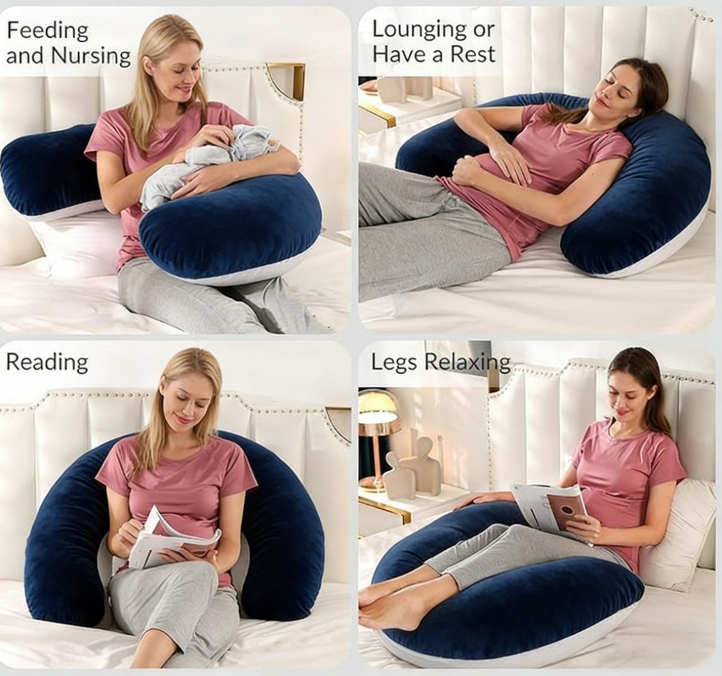 This pregnancy pillow is designed to provide full-body support for expecting mothers. It helps support the belly, back, hips, knees, neck, and head, reducing pressure and improving sleep comfort during pregnancy.