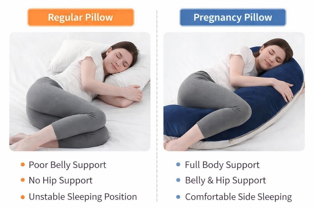 A:A pregnancy pillow for side sleeping provides full-body support during pregnancy. It helps support the back, hips, knees, neck, and head, reducing pressure and easing discomfort caused by body changes. This support helps pregnant women maintain a comfortable and stable sleeping position throughout the night.
