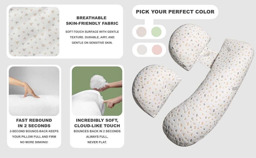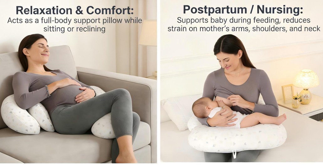 This pregnancy pillow provides full body support for side sleepers, helping relieve back pain and improve sleep comfort during pregnancy. It also works as a nursing pillow for breastfeeding after birth.