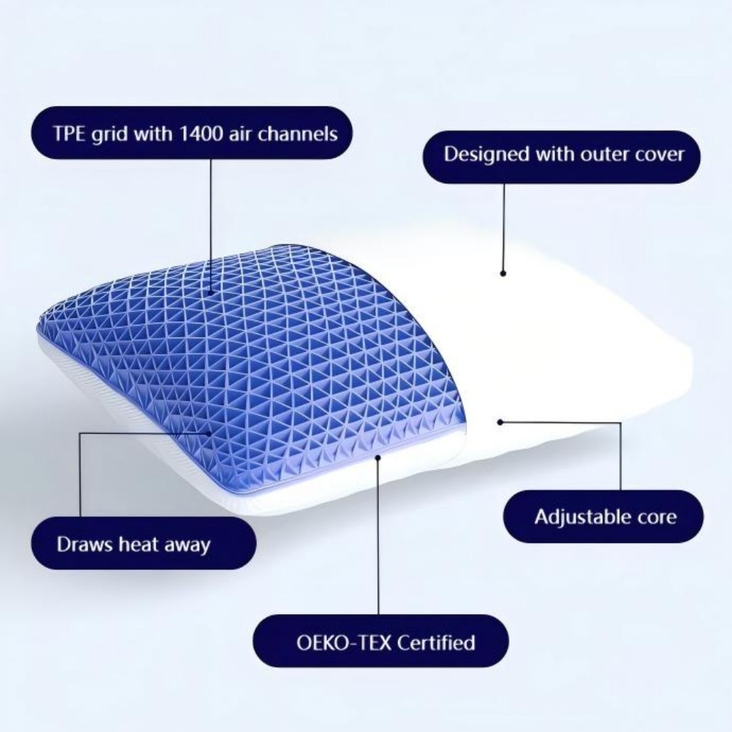 Cet oreiller est conçu pour ceux qui se réveillent souvent avec une sensation de chaleur la nuit. Il combine un confort rafraîchissant avec un soutien ergonomique, vous aidant à dormir paisiblement, confortablement et sans être dérangé.